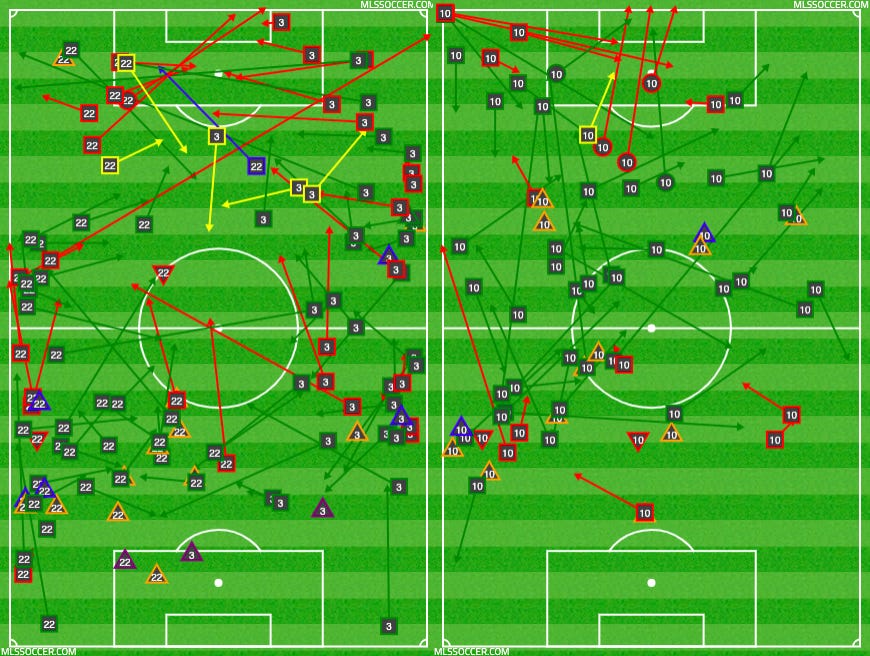 The starting point for the new scheme is NYCFC's quality depth at the back. Alexander Callens and Maxime Chanot have been one of the most formidable defensive tandems in MLS the last couple years, but center back is arguably James Sands’ best position as well, so Dome threw all of them out there in a strong back three that balanced physicality and ball skills. The wider base allowed Ronald Matarrita and Anton Tinnerholm to push up from fullback to wingback, possibly a more natural position for both of them. Their five key passes and one assist were the strongest offensive showing of the season from NYCFC's outside backs.
