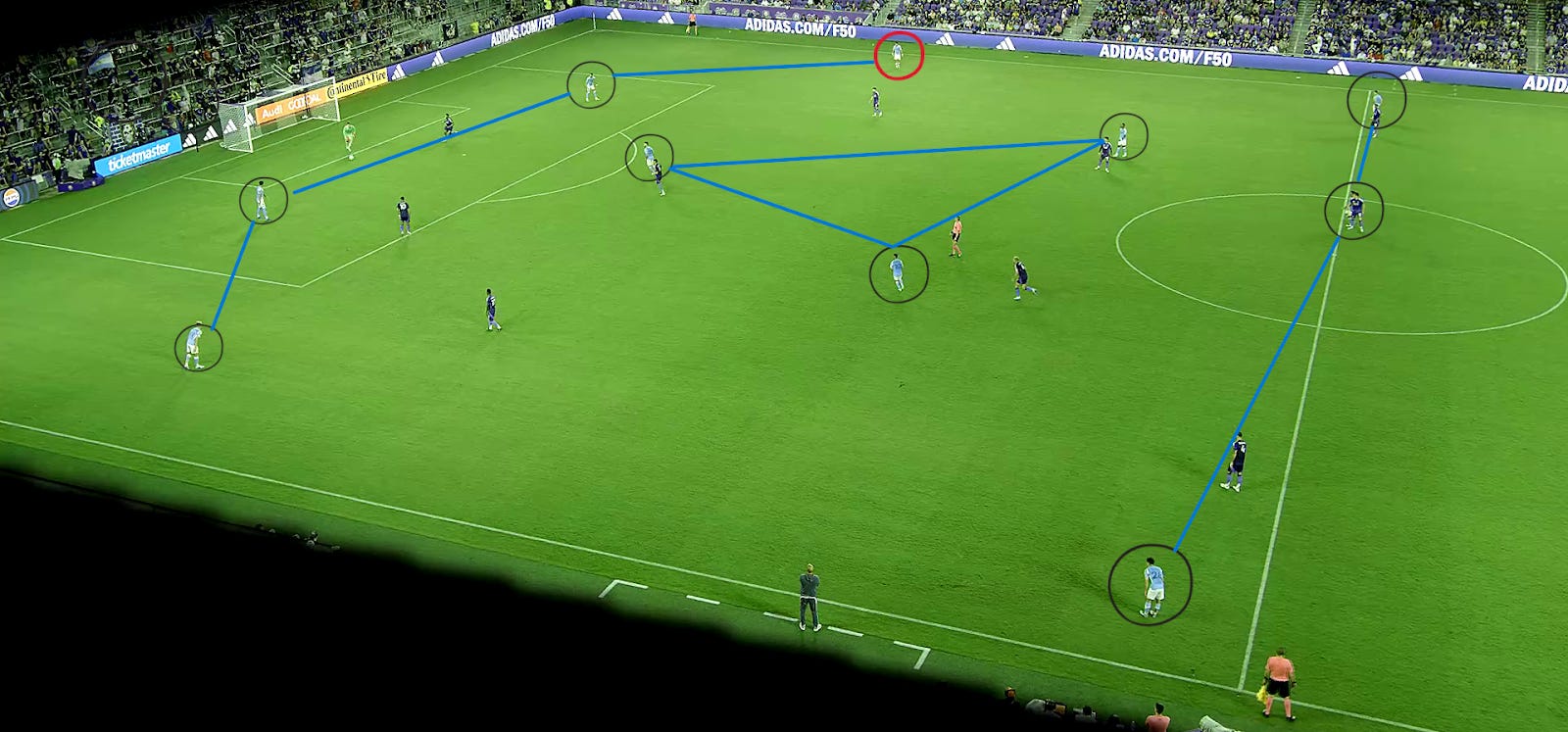 In the second half, Jansen countered by shifting to a box midfield, creating a four-on-three overload that opened up space on the wings and led to a more cohesive attack as NYCFC pushed for an equalizer. However, without Risa, O’Toole moved inside instead of Haak, playing an inverted fullback role reminiscent of Philip Lahm during Pep Guardiola’s tenure at Bayern Munich.