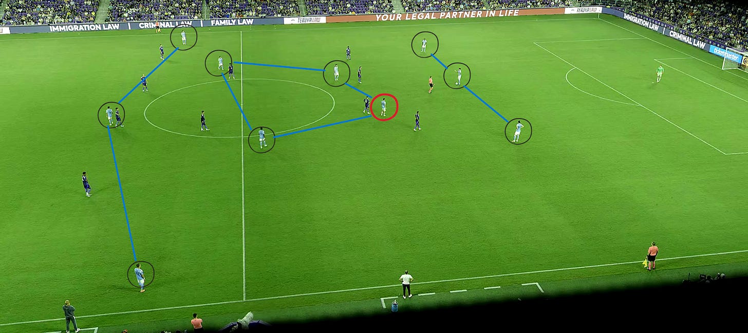 But on offense, Perea was still essentially playing the same central midfield position in the left half space that he had played against Orlando, with O’Toole as the primary provider of width on the left side. The box formation once again caused significant problems for Sporting KC, as NYCFC found ample space in the midfield to quickly build up and attack in a game that they probably should have won, given their xG differential of nearly a goal.
