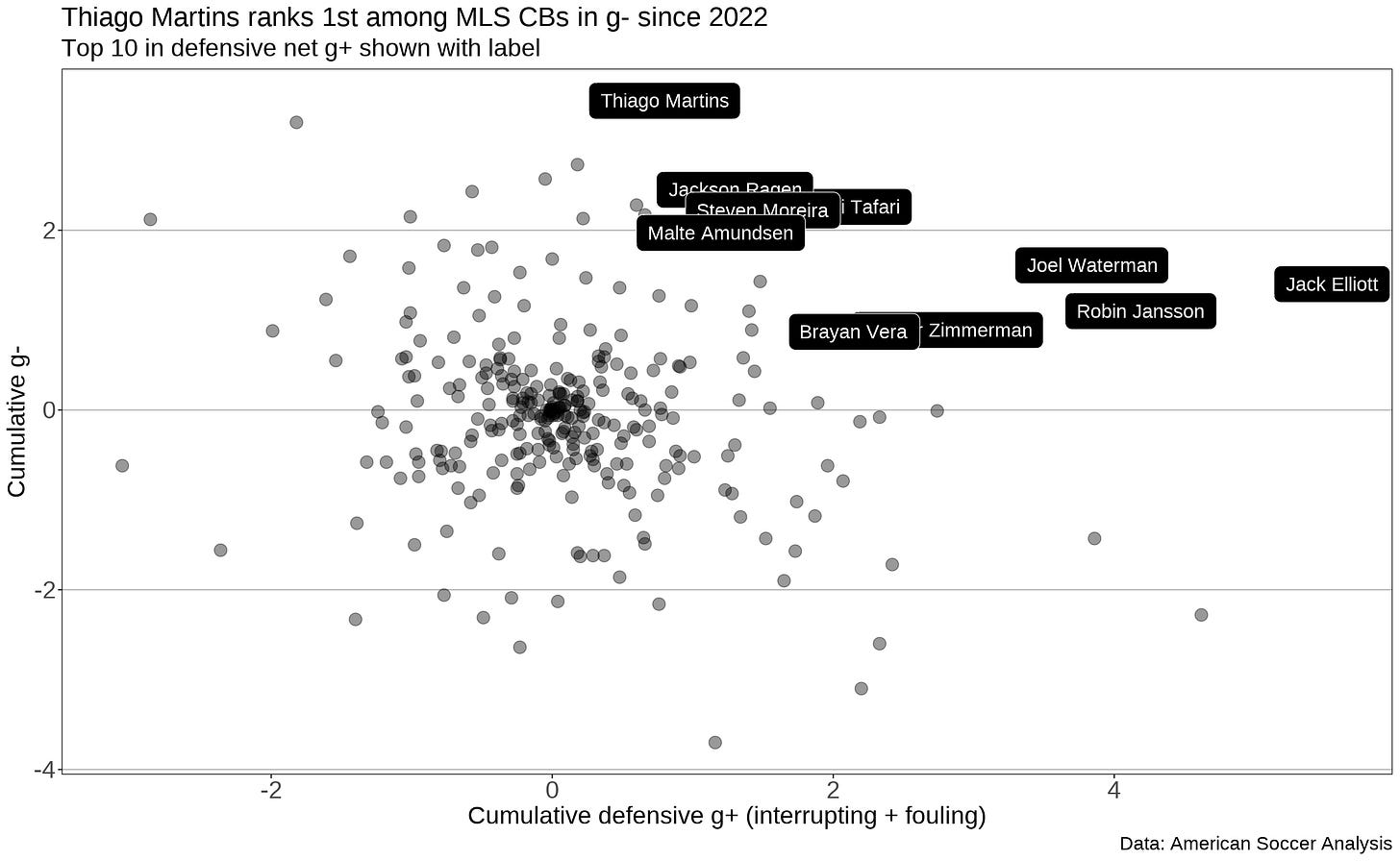 Having Martins on the field would not have been enough to turn this game into a good defensive performance, but it’s fair to say he would have handled these critical 1v1s with White better. Martins leads all Major League Soccer center backs in cumulative goals subtracted (g-), a methodology that allocates team goals added (g+) to individuals, since he joined the team in 2022 and is 5th in defensive net g+. He cleans up messes in the back and gives his team a puncher’s chance even when the defense struggles.