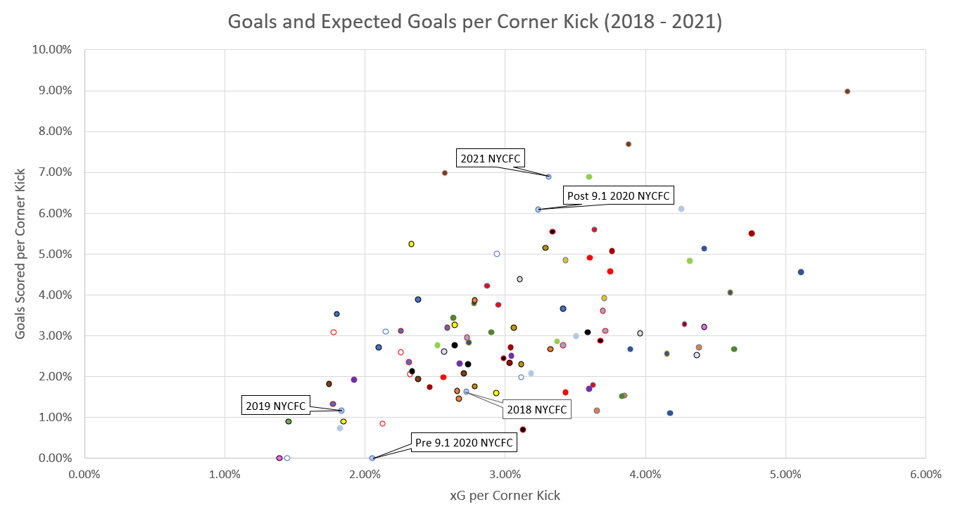 From 2015 through 2019, NYCFC ranked 19th of 20 MLS teams1 in scoring off corner kicks. The struggles were well known among the New York City faithful who watched specialist Andrea Pirlo, who only generated 2.67 Expected Assists off corner kicks over three seasons, become increasingly impotent in MLS and failed to deliver dangerous chances off set pieces.