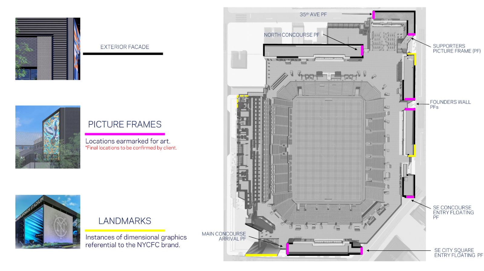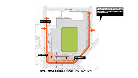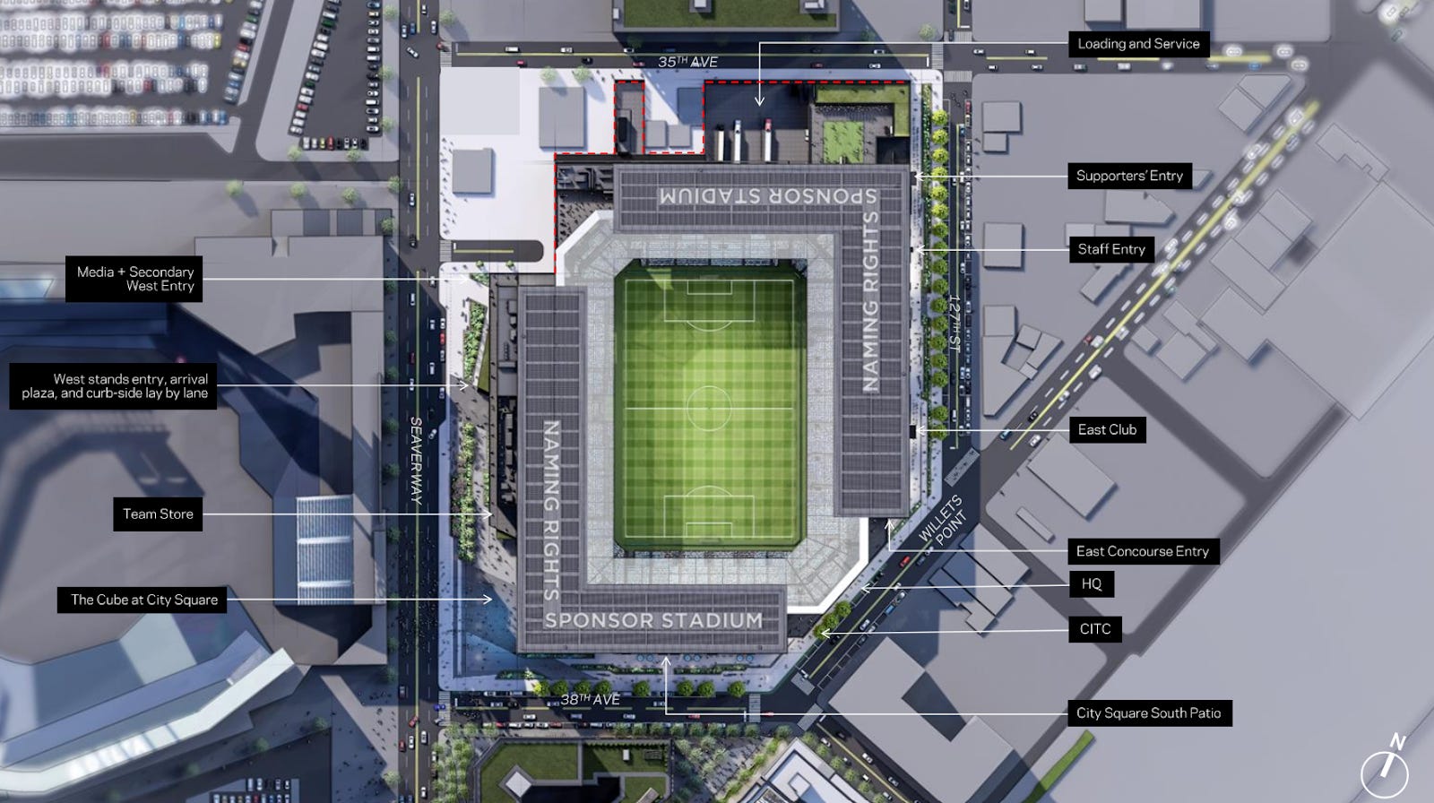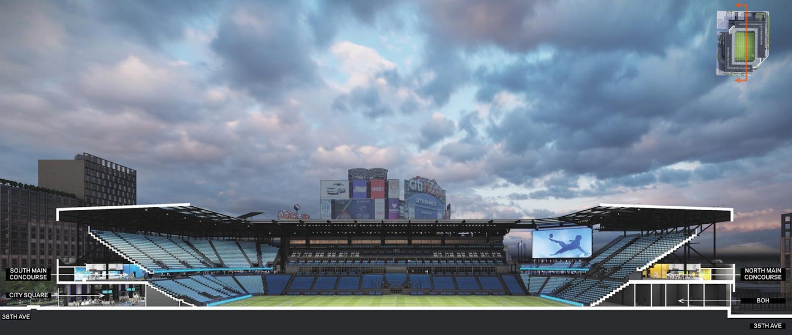 The south end is planned to have City Square at the field level and a main concourse level above that, while the north end will have the main concourse level above “back of house” functions. City Square is a public plaza with stand-alone food and beverage facilities and is intended to function both on NYCFC gamedays and non-gamedays.