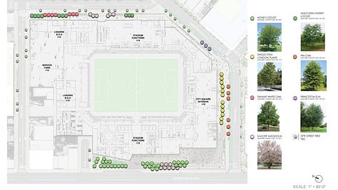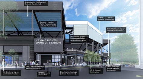 The presentation further explores the stadium's stylistic choices, including colors, types of lighting, materials used, and planned vegetation. Additional planning photos are included below. Fans fond of pigeon imagery may be excited to see more pigeon-themed murals in the design documents. Fans not fond of this imagery may be pleased to see a disclaimer indicating it is a "placeholder design."