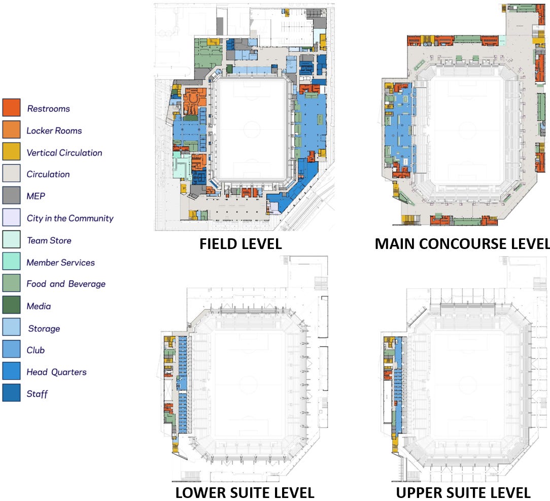 The presentation also provides detailed plans of intended use within each level. The field level serves not only where the game will be played, but also as the entry point for fans. Multiple entrances are planned on both the east and west sides of the stadium, with nearly all attendees needing to ascend to the Main Concourse to access their seats at some point.