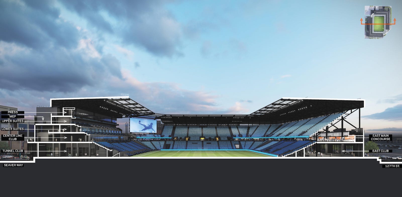 The lower bowl of the stadium's east side also comprises club seating, with the East Club at field level. In a March 2024 interview, CEO Brad Sims mentioned that the club would look to capitalize on “sponsorship and premium hospitality seating” which CEO Brad Sims mentioned NYCFC struggles to fill due to the current baseball stadium constraints. Sims told The Outfield that the stadium would be designed with roughly 20% premium hospitality seating and 80% general seating and that the revenue from those premium seats would help keep the remaining seating more affordable. With three different clubs in the design and two levels of premium suites planned, this vision is taking further shape.